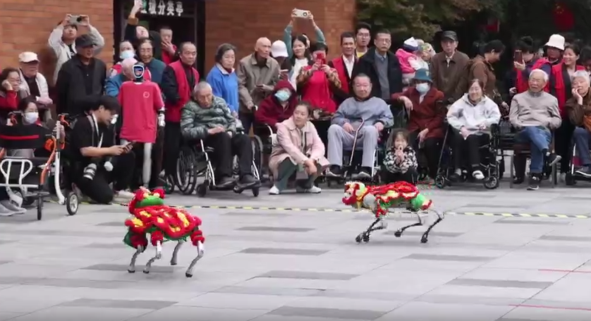 穿红袄的机器狗扭动身姿,陪伴机器人眨着大眼睛打招呼,引得老人们纷纷拍照留念。