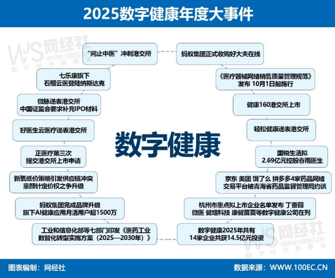 2025 年数字健康赛道核心呈现企业扎堆资本化、互联网巨头深度布局、政策监管 + 产业扶持并行、细分赛道竞争白热化四大特征:问止中医、微脉等多家企业扎堆递表港交所,石榴云医登陆纳斯达克,春雨医生迎来股权变动;蚂蚁集团收购好大夫在线、发力 AI 健康。政策端监管趋严并出台数智化转型方案,药品网售平台被约谈,医美赛道则爆发定价权冲突,行业走向规范化与整合升级。