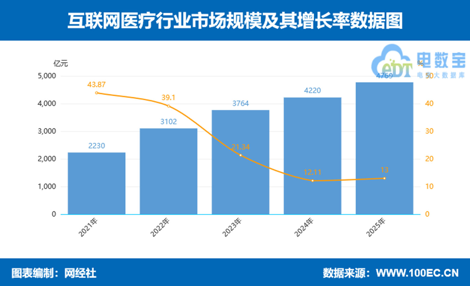 《报告》显示,据“电数宝”显示,2025年互联网医疗市场规模4769亿元,同比增长13%。此外,2021年-2024年市场规模(增速)分别为:2230亿元(43.87%)、3102亿元(39.1%)、3764亿元(21.34%)、4220亿元(12.11%)。