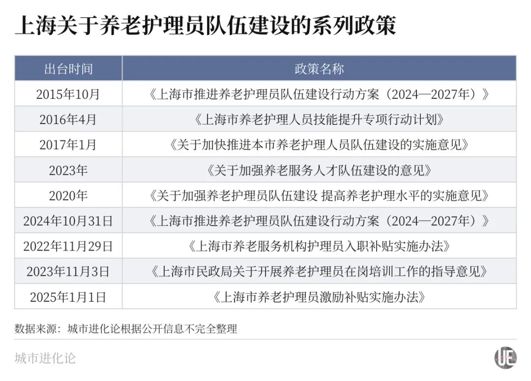 建强养老护理员队伍,才能形成养老服务高质量发展的关键支撑。所以,从2015年起,上海就开始为养老护理员队伍建设出台系列的专项规划,“十四五”期间则密集出台了一波。