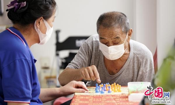 2020年8月6日,一位老人在丰台区康助护养院宛平城养老服务驿站和工作人员(左)下棋。新华社记者 李欣 摄