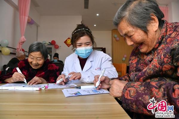 2021年2月8日,在郑州爱睦家护理院,医护人员指导老人涂色卡。新华社记者 李嘉南 摄