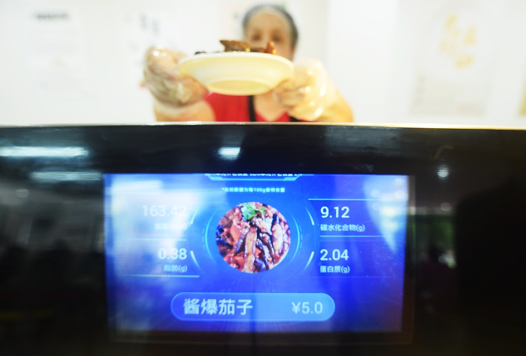 杭州西湖区的一家智慧老年食堂电子屏幕上贴心显示山药排骨的主要营养成分。