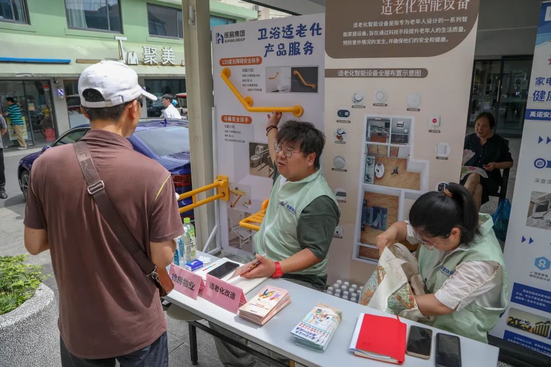 其中,最热闹的当属徐房物业适老化改造成果展区。一面照片墙通过实景还原的浴室、卧室场景,生动展示了扶手、防滑垫等适老化产品的安装效果。“这种沉浸式展示比发传单管用多了,我看完就预约了马桶扶手安装。” 刚退休的李阿姨笑着说。