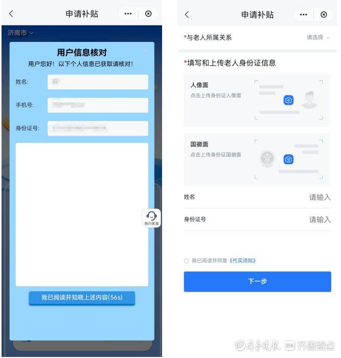 2. 弹出窗口用户信息核对,如果消费者年龄不满60周岁,则会弹出代买老人的身份信息上传窗口,按照要求上传老人相关信息。