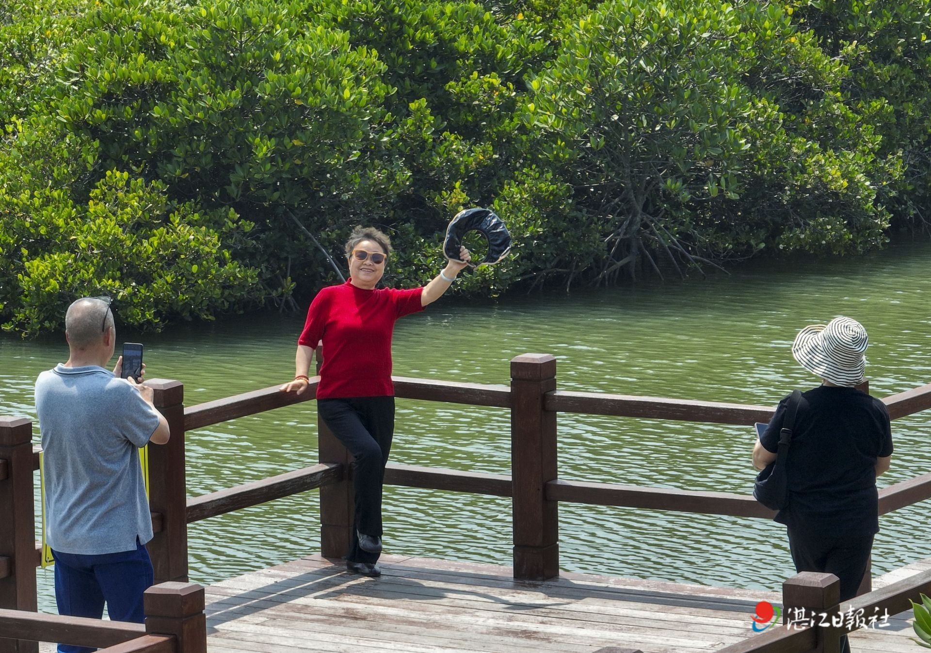 老年游客在麻章区金牛岛红树林游玩。(资料图)