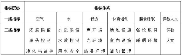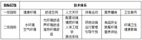 作为我国首部系统性聚焦中小学校健康环境建设的权威标准,《健康中小学校评价标准》适用于各类新建中小学校的健康性能评价,改扩建校园在技术条件相同时可参照执行。标准建立了由6个一级指标、17个二级指标组成的技术体系,包括38个控制项条文,85个评分项条文。体系构成如下: